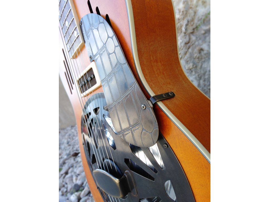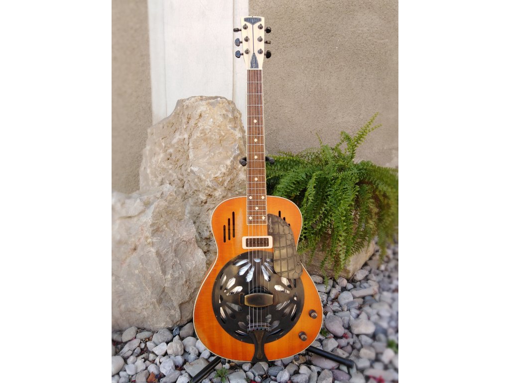 Anegree body with maple neck, our 9,5´´ hand spun cone, the Duotone System - our Biscuit pickup and neck P90, Volume and Blender control, the brass plate pickguard.