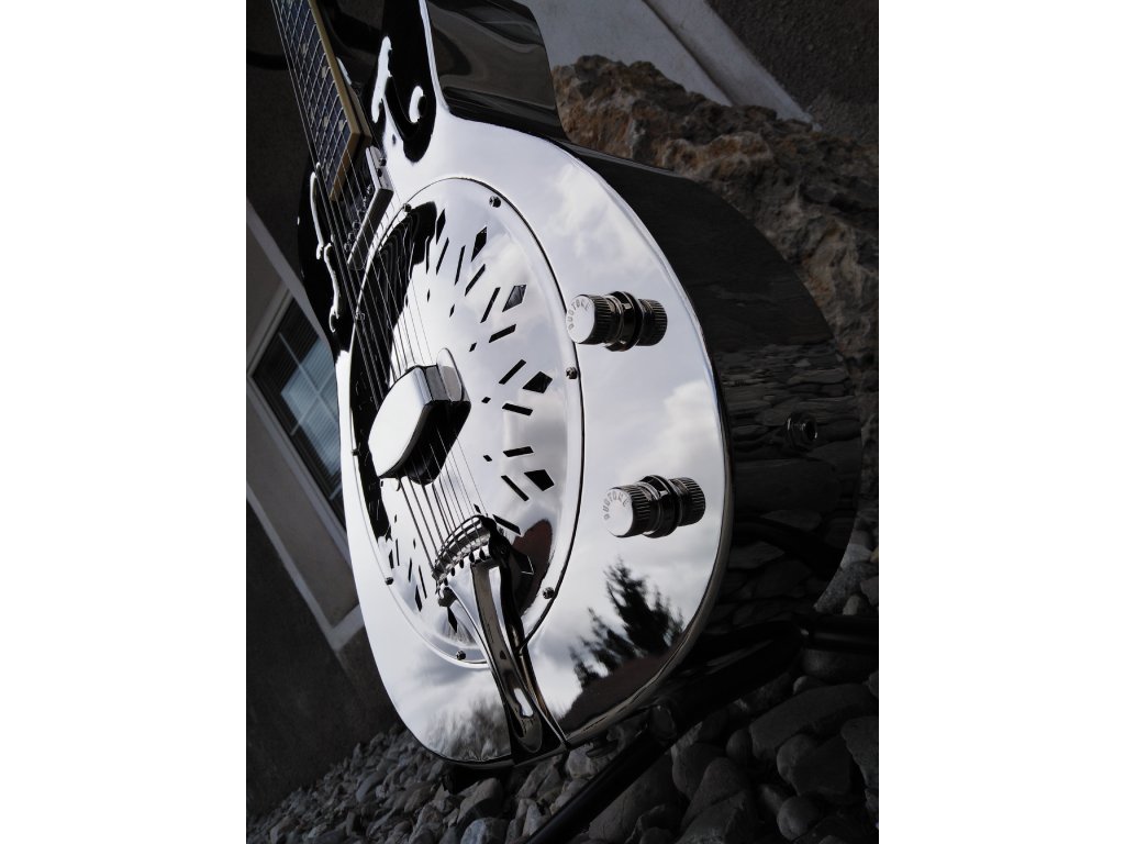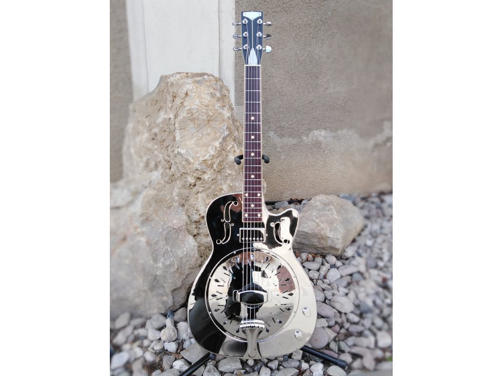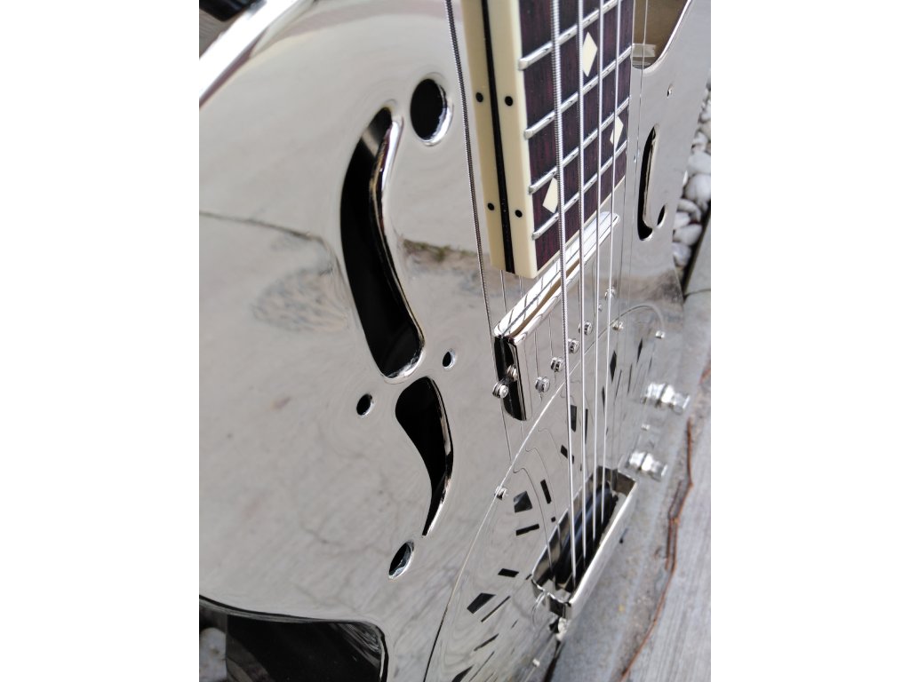 Super shiny beauty with brass body and mahogany neck. Our Duotone System with two pickups, Volume and Blender control (Volume pot is push/pull). HB, P90 soapbar or P90 hb size on neck position. Our 9,5" hand spun cone, our Biscuit Pickup built-in directly into biscuit.